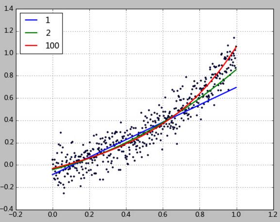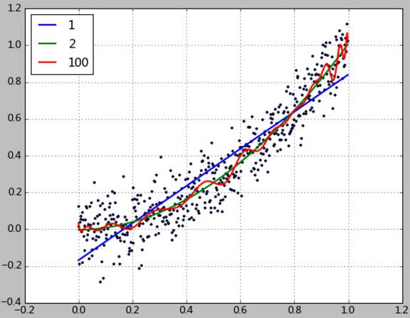 本例中使用一个2次函数加上随机的扰动来生成500个点,然后尝试用1、2、100次方的多项式对该数据进行拟合。