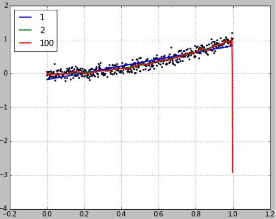 使用100次方多项式做拟合,效果确实是高了一些,然而该模型的据测能力却极其差劲。