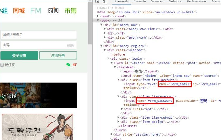 通过浏览器F12元素逐层查看到(我是用的Chrome),邮箱/手机号标签的name="form_email", 密码的标签name="form_email",如下图红框所示。