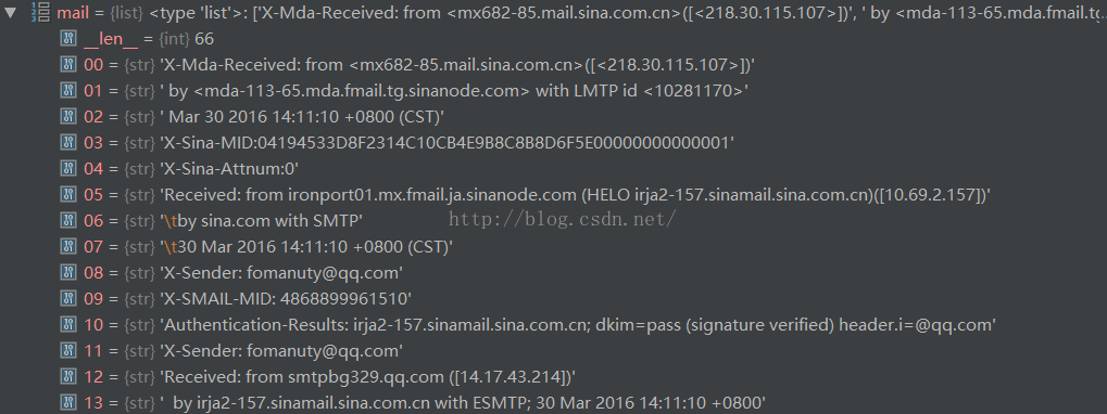 我们看到注释,可以知道,retr方法可以获取指定编号的邮件的全部内容,其返回形式为[response, ['line', ...], octets],可见,邮件的内容是存储在返回的tuple的第二个元素中,其存储形式为一个数组。我们测试一下,该数组是怎么样的。