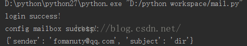 上述代码先登录邮箱,然后获取其第一封邮件并删除之,然后获取该邮件的主题和发送方并打印出来,最后再发送一封成功邮件给另一个bossMail邮箱。
