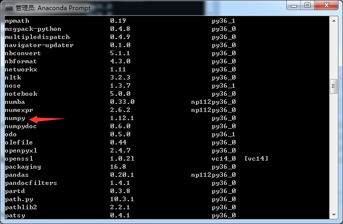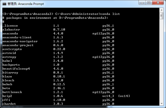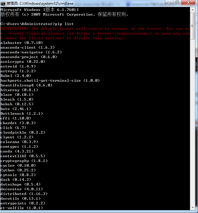 查看已经安装的包我们可以在命令提示符中输入pip list或者用anaconda自带的包管理器conda(conda list)。