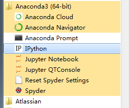 在所有程序里面可以看到安装的组件,有Anaconda管理器(Anaconda Command Prompt),IPython Notebook,IPython QT,IPython,Spyder。点击IPython,进入IPython的界面。