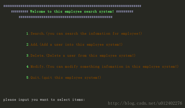 print("\033[32m\033[1m\t\t\t5\033[33m\033[1m.Quit.(quit this employee system!)\n")