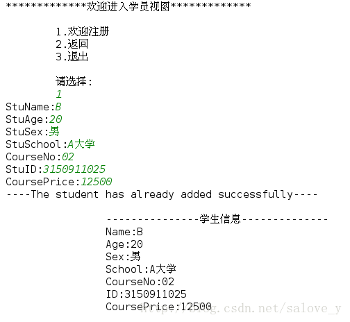 """ %(self.StuName,self.StuAge,self.StuSex,self.StuSchool,self.CourseNo,self.StuID,self.CoursePrice))