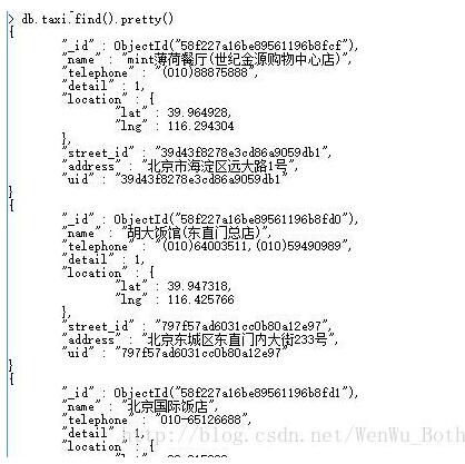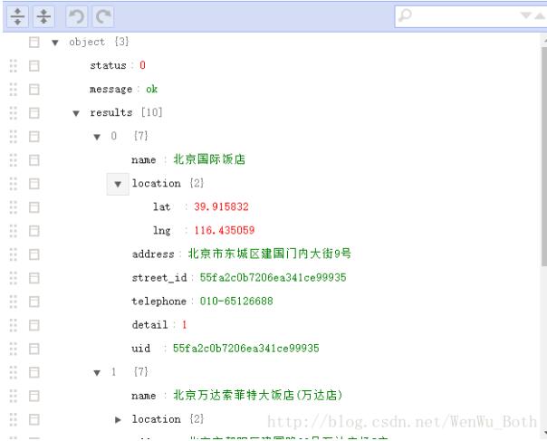 上图是将返回的json数据解析之后的结果,可以看到,服务器返回了10条北京市的饭店的信息,包括饭店名称、经纬度、地址、联系电话等。
