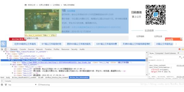 3、打开线路链接,就可以看到具体的站点信息了,打开页面分析文档结构后发现:线路的基本信息存放在<div class="bus_i_content">里面,而公交站点信息则存放在<div class="bus_line_top">及<div class="bus_line_site">里面,提取代码: