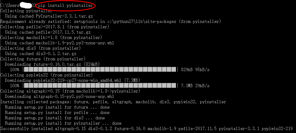 首先完成第一步,在安装python后,完成环境变量的配置,这点我在这里不赘述,请在博客园上查。这里简单介绍下在cmd上安装pyinstaller。为啥用它呢?请百度,我现在也一知半解。安装命令:pip install pyinstaller,具体安装过程如下截图: