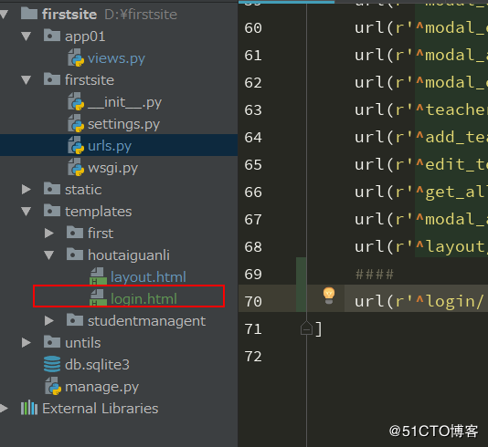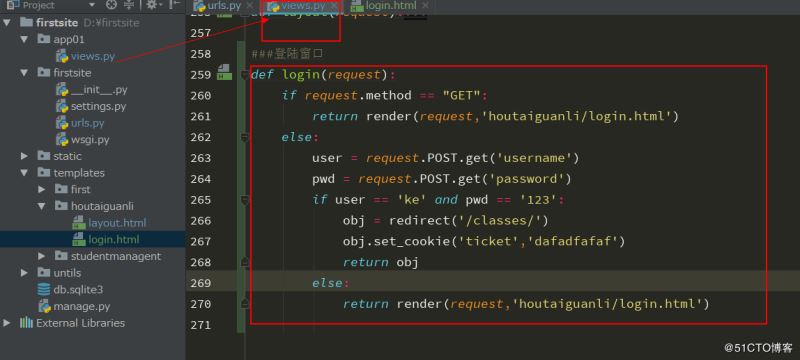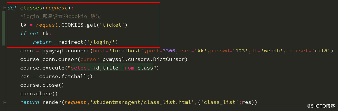 return render(request,'houtaiguanli/login.html')这里设计登录成功后可以正常访问班级页面即“classes”,所以要在班级方法那里做个判断。如果判断为用户已经登录,则可以正常访问。判断用户没有正常登录,则让它跳转到登录页面继续登录