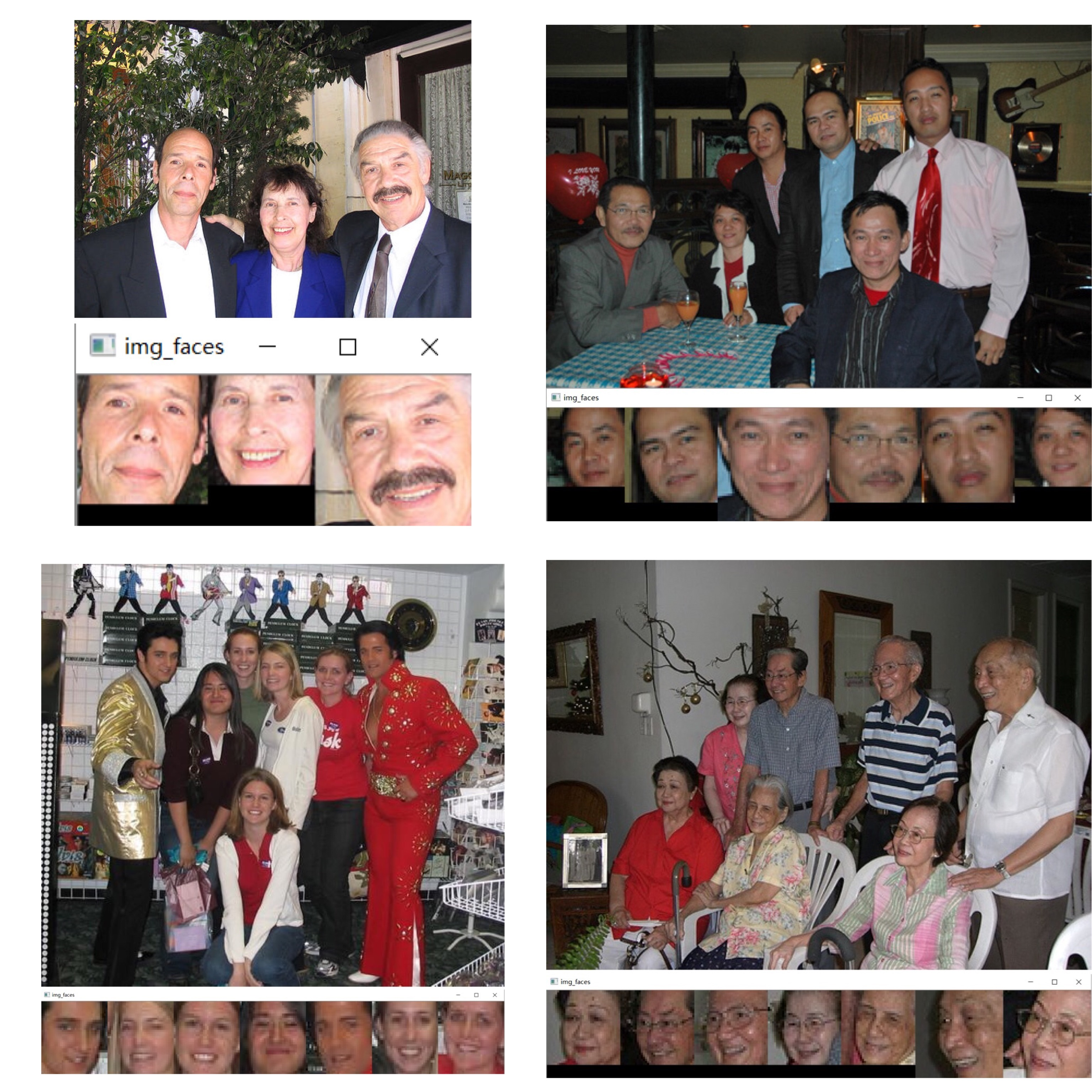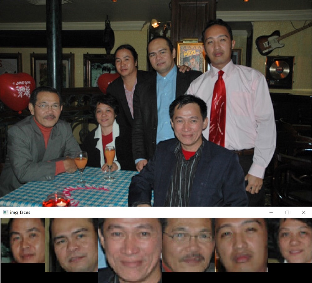 利用python开发,借助Dlib库进行人脸识别,然后将检测到的人脸剪切下来,依次排序显示在新的图像上;