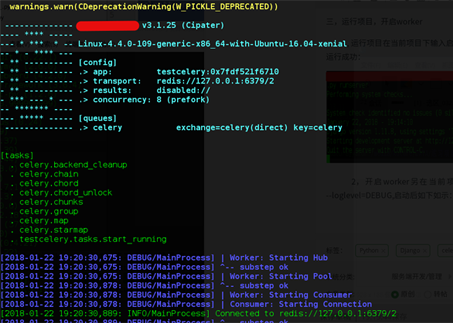 2,开启worker另在当前项目下另打开一个终端,输入指令: celery -A TestCelery worker --loglevel=DEBUG,启动后如下如示:
