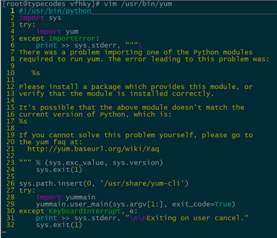 直接执行 yum 命令就会提示 /usr/bin/yum 文件第34行有错误:
