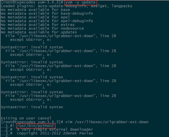尝试执行 yum -y update 命令更新CentOS系统,结果在文件 /usr/libexec/urlgrabber-ext-down 第28行处还是报 SyntaxError: invalid syntax 的错误。
