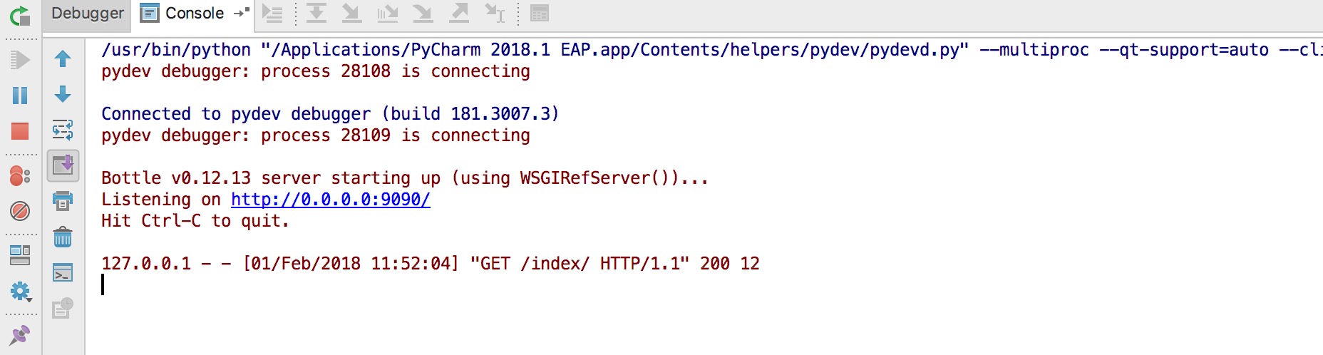 点击右键运行Debug 'main'后,下方的Debug窗口会出现ImportError: No module named 'bottle'这样的提示,提示导入bottle包出错