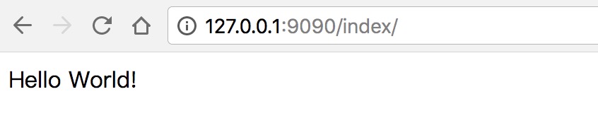 我们打开浏览器,在地址栏处输入http://127.0.0.1:9090/index/ 回车后就可以看到Hello World了