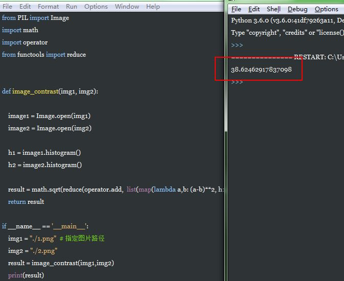 from PIL import Image import math import operator from functools import reduce def image_contrast(img1, img2): image1 = Image.open(img1) image2 = Image.open(img2) h1 = image1.histogram() h2 = image2.histogram() result = math.sqrt(reduce(operator.add, list(map(lambda a,b: (a-b)**2, h1, h2)))/len(h1) ) return result if __name__ == '__main__': img1 = "./1.png" # 指定图片路径 img2 = "./2.png" result = image_contrast(img1,img2) print(result)
