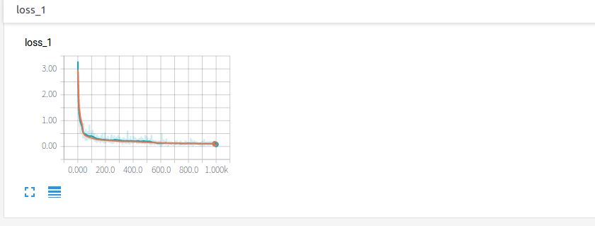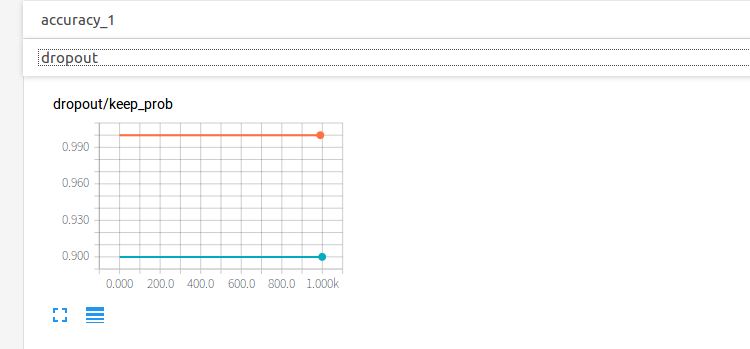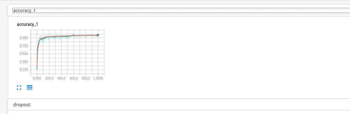 点开accuracy,红线表示test集的结果,蓝线表示train集的结果,可以看到随着循环次数的增加,两者的准确度也在通趋势增加,值得注意的是,在0到100次的循环中准确率快速激增,100次之后保持微弱地上升趋势,直达1000次时会到达0.967左右