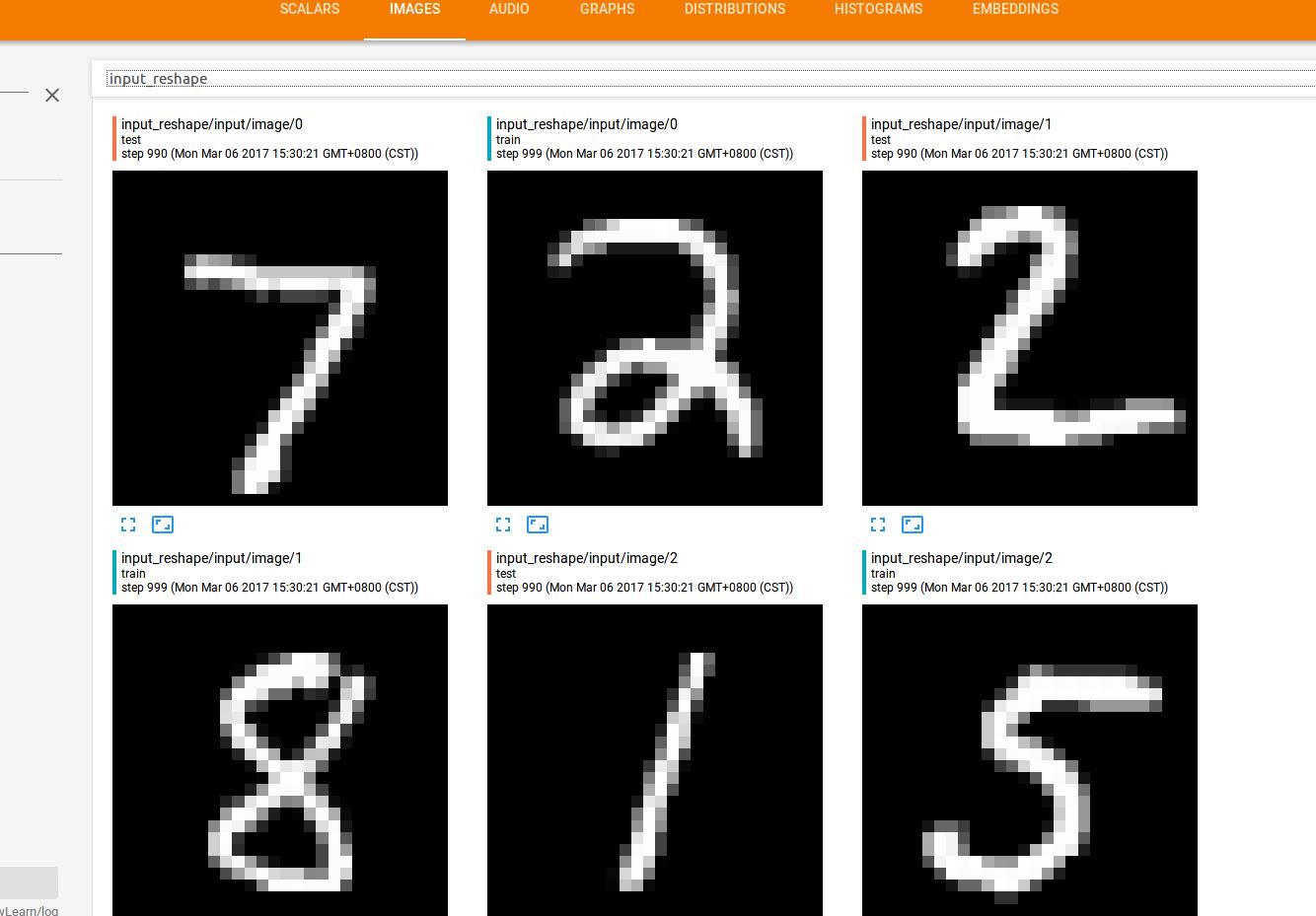 特征数据其实就是图像的像素数据拉升成一个1*784的向量,现在如果想在tensorboard上还原出输入的特征数据对应的图片,就需要将拉升的向量转变成28 * 28 * 1的原始像素了,于是可以用tf.reshape()直接重新调整特征数据的维度: