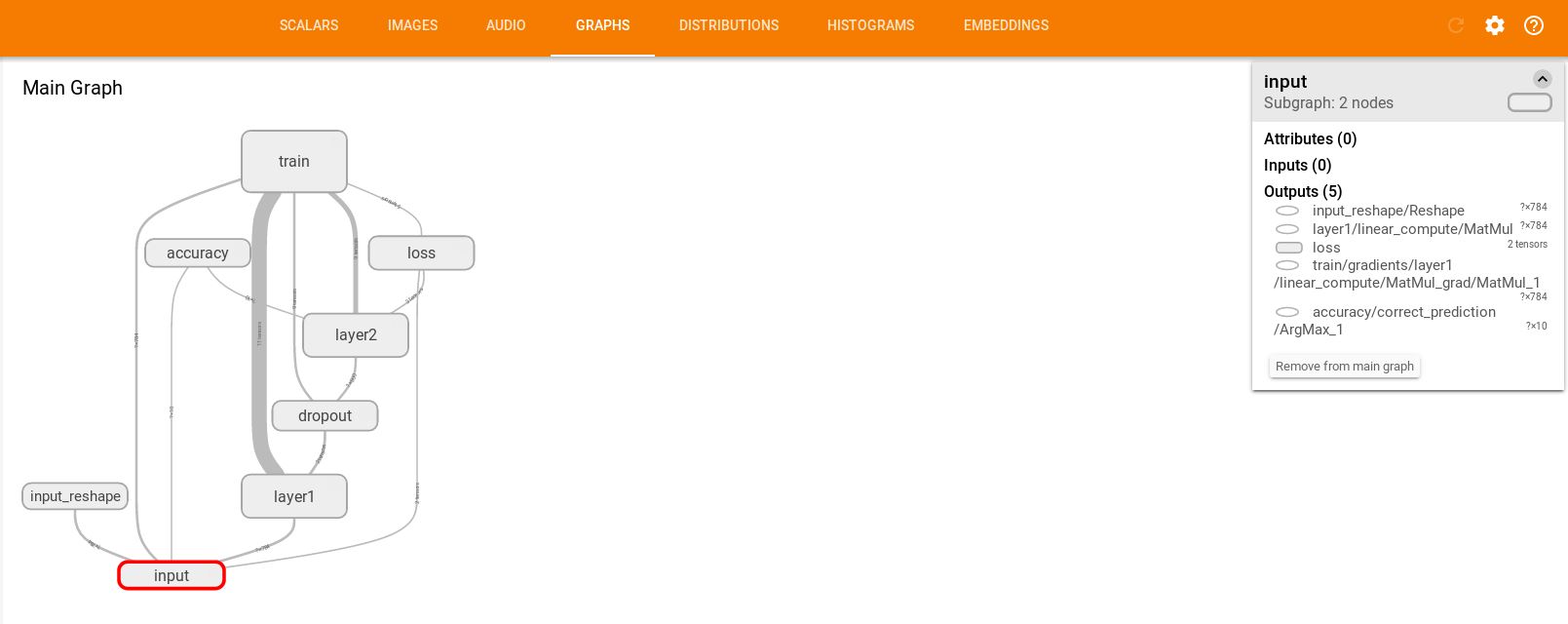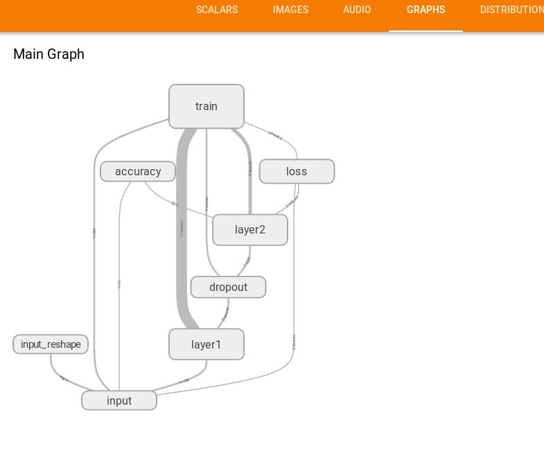 回顾本文程序中定义的标量有:准确率accuracy,dropout的保留率,隐藏层中的参数信息,已经交叉熵损失。这些都在SCLARS窗口下显示出来了。