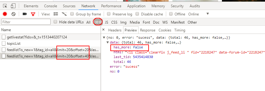 滚动条向下第3次滚动到底部,再无xhr请求。