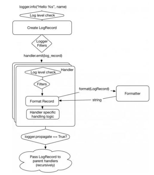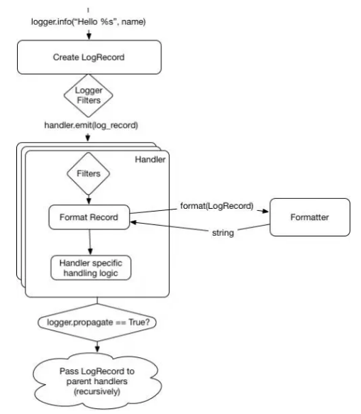 在日志记录被传递到所有记录器内的处理器时,父级处理器将会进行递归处理,直到我们到达顶级的记录器(被定义为一个空字符串),或者有一个记录器设置了 propagate = False。我们可通过更新的图中看出: