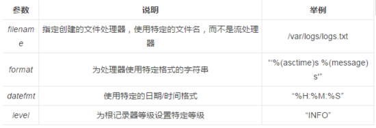 这是至今最简单的设置日志记录的方法。使用 logging.basicConfig(level=”INFO”) 搭建一个基础的 StreamHandler ,这样就会记录在 INFO 上的任何东西,并且到控制台以上的级别。以下是编写基础设置的一些参数: