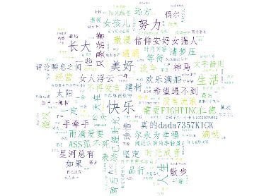 分析好友签名,签名是好友信息中最为丰富的文本信息,按照人类惯用的”贴标签”的方法论,签名可以分析出某一个人在某一段时间里状态,就像人开心了会笑、哀伤了会哭,哭和笑两种标签,分别表明了人开心和哀伤的状态。这里我们对签名做两种处理,第一种是使用用结巴分词进行分词后生成词云,目的是了解好友签名中的关键字有哪些,哪一个关键字出现的频率相对较高;第二种是使用SnowNLP分析好友签名中的感情倾向,即好友签名整体上是表现为正面的、负面的还是中立的,各自的比重是多少。这里提取Signature字段即可,其核心代码如下: