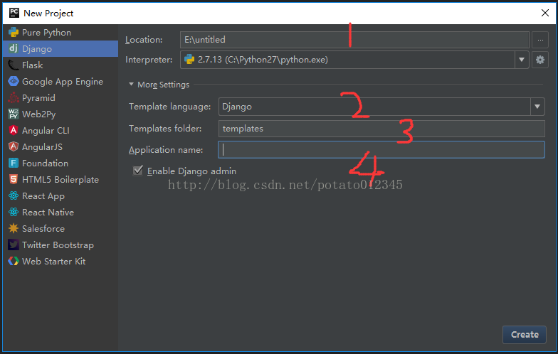 图中编号1处为项目位置;编号2处为使用的模板语言类型,默认为Django模板语言;编号3处是保存项目页面HTML的文件夹名称,默认为templates;编号4处是应用名,一般根据Web应用的实际功能来命名。本示例中,我们项目位置为E:\testDjango,应用名为fakeCSDN。设置填写完毕后,点击右下角的Create,创建项目。