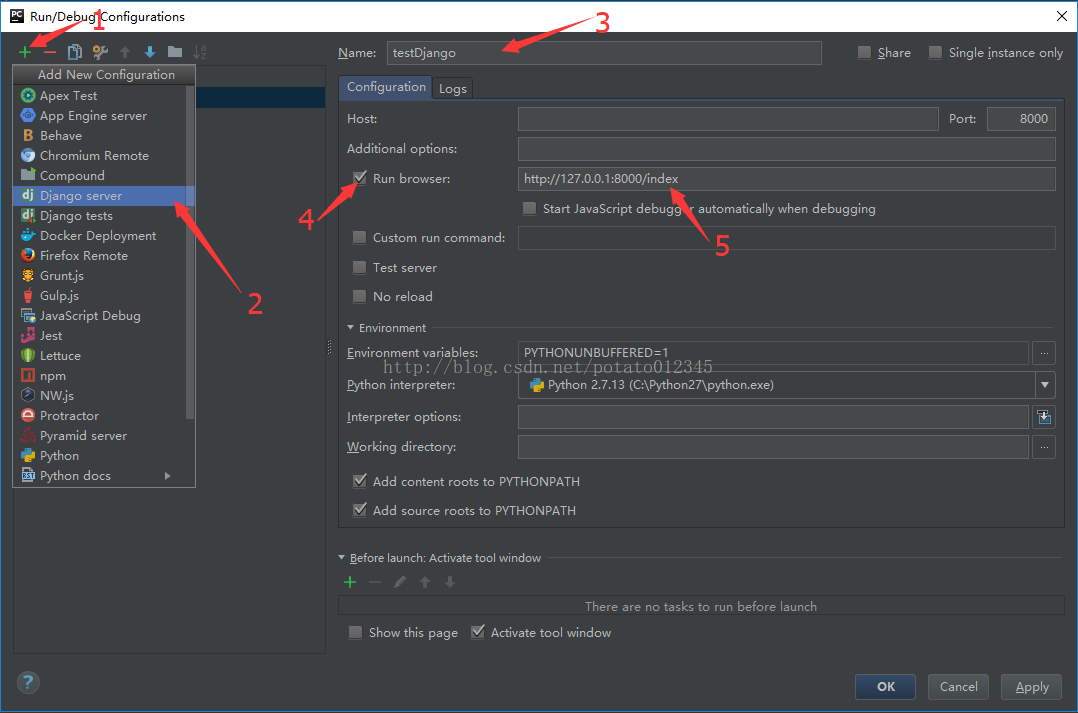 若未自动出现图示按钮,可以点击向下的灰色三角,选择 Edit Configurations ,弹出如下窗口通过1,2 两步添加一个新的Django Server,在3处输入服务器名称,在5处输入启动页面。点击OK即可。