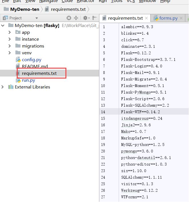 即可在项目根目录下看见一个requirements.txt文件,文件中显示出本项目所有配置依赖包信息。具体见下图: