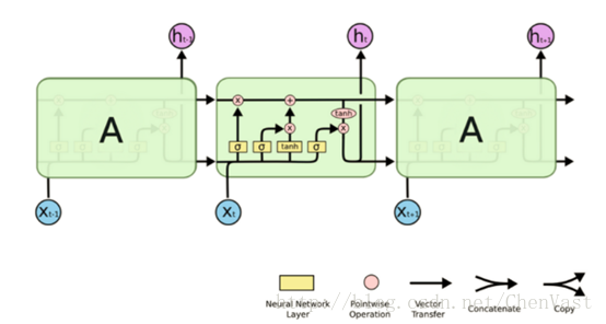 粉色的圈代表 pointwise 的操作,诸如向量的和,而黄色的矩阵就是学习到的神经网络层。合在一起的线表示向量的连接,分开的线表示内容被复制,然后分发到不同的位置。