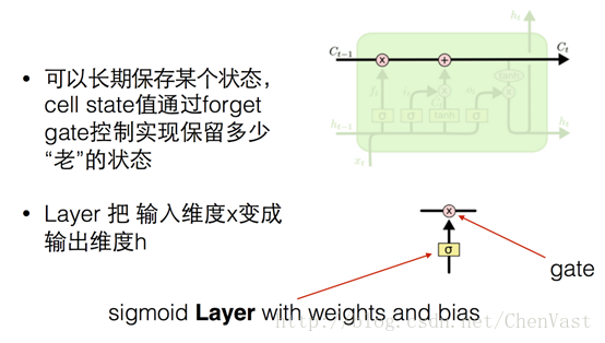 “门”是一种让信息选择式通过的方法,包含一个sigmoid 神经网络层和一个 pointwise (按位做乘法)的操作。