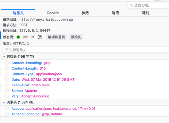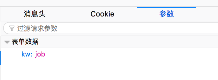 然后我们可以从方法为POST的请求中找到参数为:kw:job(job是输入翻译的内容)