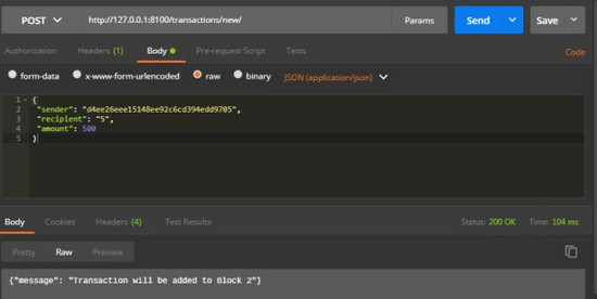 注意交易的接收者是我们自己的服务器节点,我们做的大部分工作都只是围绕Blockchain类方法进行交互。到此,我们的区块链就算完成了,我们来实际运行下
