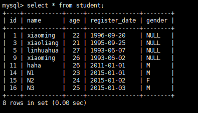 create table student( id int auto_increment, name char(32) not null, age int not null, register_date date not null, primary key(id) );