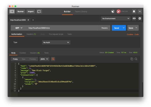 然后在节点2上挖两个块,确保是更长的链,然后在节点1上访问接口/nodes/resolve ,这时节点1的链会通过共识算法被节点2的链取代。