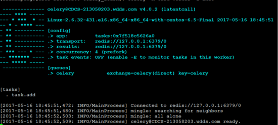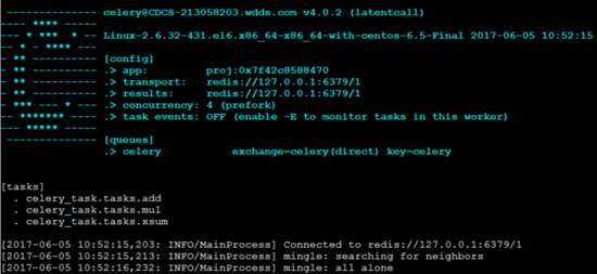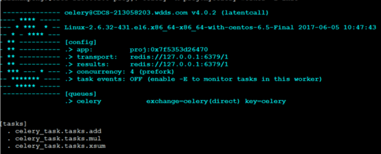 Worker进程启动和前面启动命令一样。celery –A proj.mycelery worker –l info