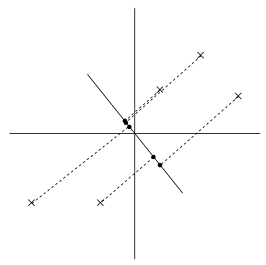 从上图可以看到,投影得到的数据仍然有很大的方差,而且投影点离原点很远。如果采取与上图u垂直的方向,则可以得到下图: