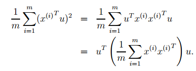 上述u的方向只是感性的选择出来的,为了将选择u的步骤正式确定下来,可以假定在给定单位向量u和数据点x的情况下,投影的长度是xTu。举个例子,如果x(i)是数据集中的一个点(上图中的一个星号),那它在u上的投影xTu就是圆点到原点的距离(是标量哦)。所以,为了最大化投影的方差,我们需要选择一个单位向量u来最大化下式: