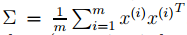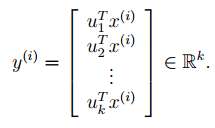 其中x(i)是属于n维空间的向量,而y(i)给出了基于k维空间的表示。因此说,PCA是一个数据降维算法。u1,u2,...,uk称为数据的k个主成分。
