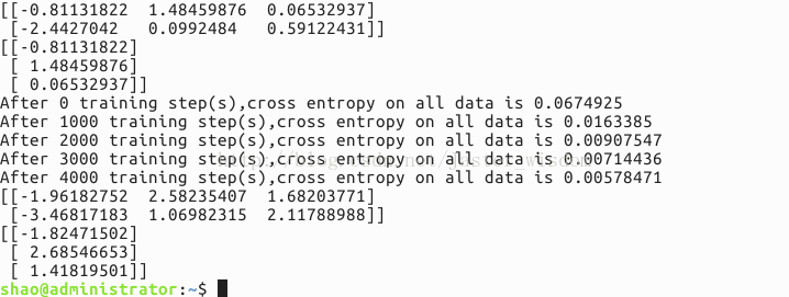首先是打印出训练之前的网络参数,也就是随机产生的参数值,然后将训练过程中每隔1000次的交叉熵输出,发现交叉熵在逐渐减小,说明分类的性能在变好。最后是训练网络结束后网络的参数。