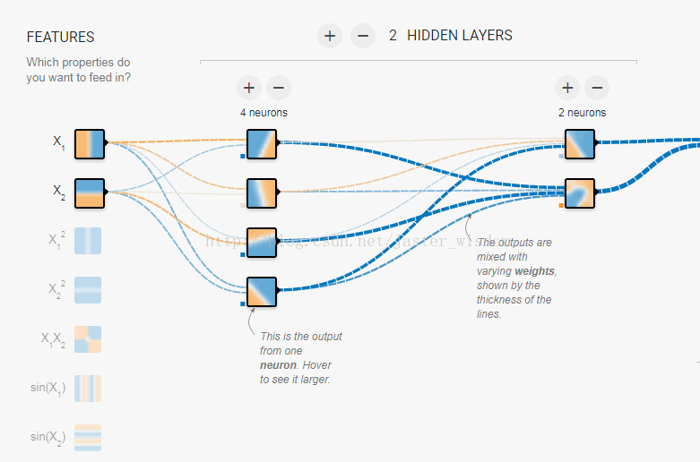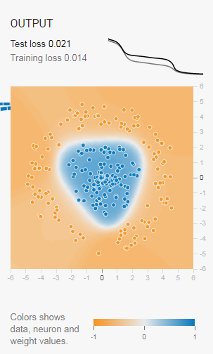 分享一个图形化神经网络训练过程的网站:点这里,可以自己定义网络参数的大小,层数以及学习速率的大小,并且训练过程会以很直观的形式展示出来。比如: