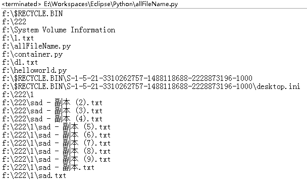 当然,这种形式有其弊端,就是不能遍历一些系统保留文件夹,如$RECYCLE.BIN、System Volume Information等,如果不写判断条件,会导致下面的读取出错。因此,以后遍历文件夹的时候,还是建议时候上面的os.walk的方式。