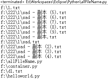 上述程序,将os.walk读取到的所有路径root、目录名dirs与文件名files,也就是三个文件数组利用foreach循环输出。
