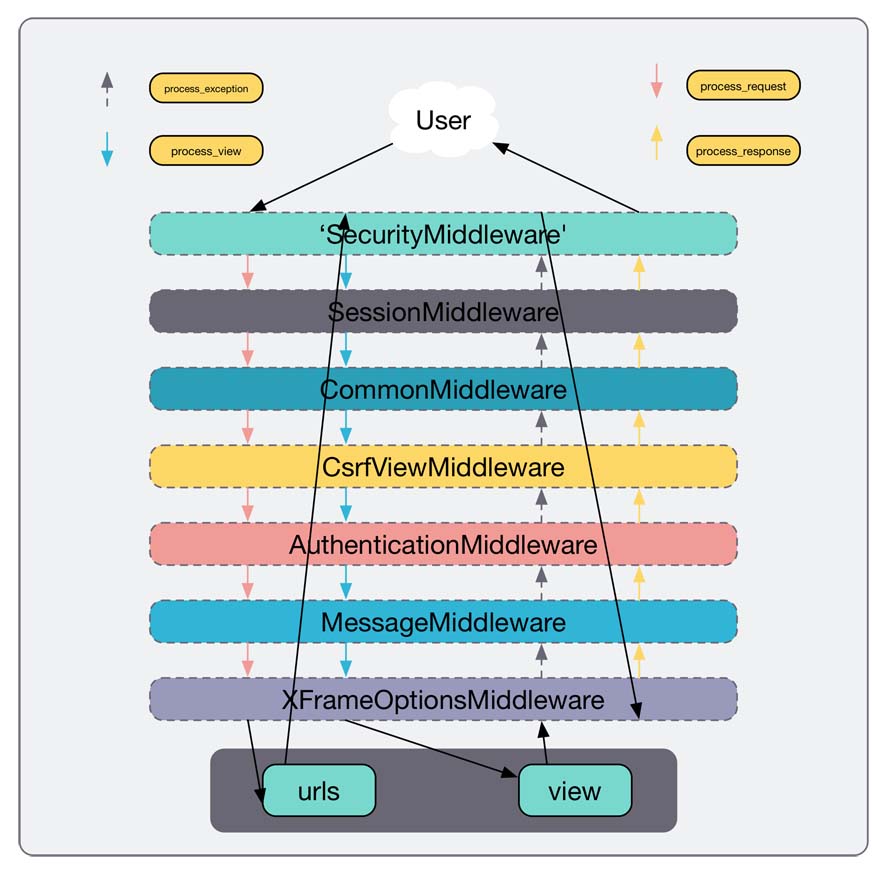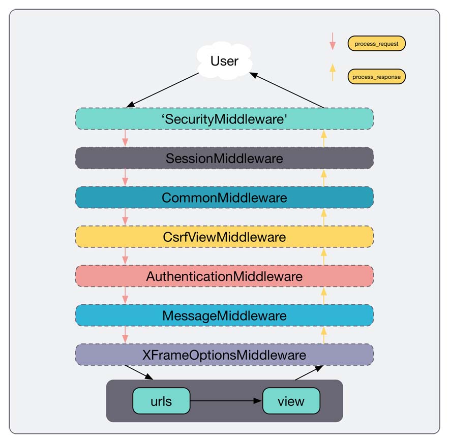 MIDDLEWARE = [ 'django.middleware.security.SecurityMiddleware', 'django.contrib.sessions.middleware.SessionMiddleware', 'django.middleware.common.CommonMiddleware', 'django.middleware.csrf.CsrfViewMiddleware', 'django.contrib.auth.middleware.AuthenticationMiddleware', 'django.contrib.messages.middleware.MessageMiddleware', 'django.middleware.clickjacking.XFrameOptionsMiddleware', ]