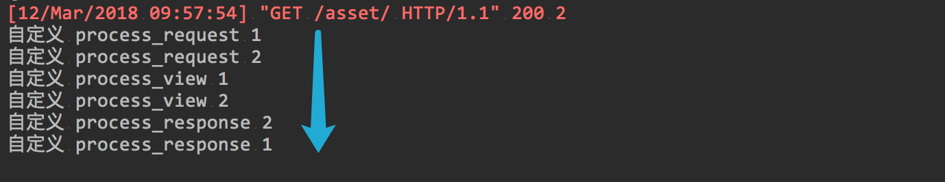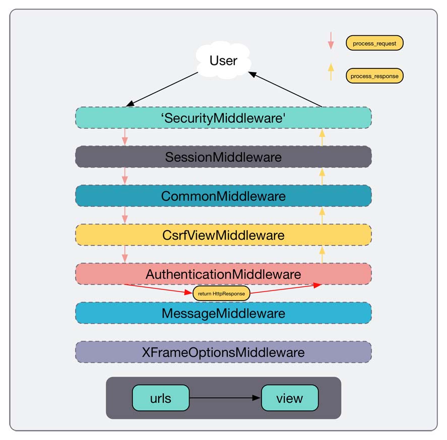 MIDDLEWARE = [ 'django.middleware.security.SecurityMiddleware', 'django.contrib.sessions.middleware.SessionMiddleware', 'django.middleware.common.CommonMiddleware', 'django.middleware.csrf.CsrfViewMiddleware', 'django.contrib.auth.middleware.AuthenticationMiddleware', 'django.contrib.messages.middleware.MessageMiddleware', 'django.middleware.clickjacking.XFrameOptionsMiddleware', 'app01.middle_by_me.MyMiddleware_1', # 第一个自定义 middleware 'app01.middle_by_me.MyMiddleware_2' # 第二个自定义 middleware ]