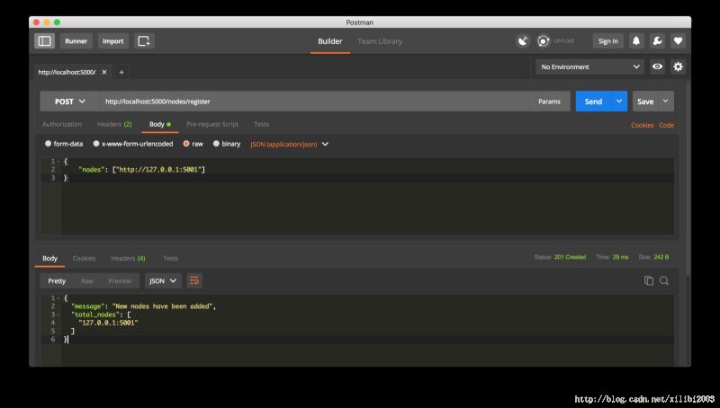 你可以在不同的机器运行节点,或在一台机机开启不同的网络端口来模拟多节点的网络,这里在同一台机器开启不同的端口演示,在不同的终端运行一下命令,就启动了两个节点:http://localhost:5000 和 http://localhost:5001
