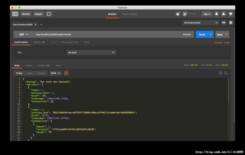 然后在节点2上挖两个块,确保是更长的链,然后在节点1上访问接口/nodes/resolve ,这时节点1的链会通过共识算法被节点2的链取代。
