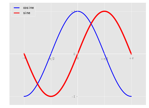 plot(X, C, color="blue", linewidth=2.5, linestyle="-", label="cosine") plot(X, S, color="red", linewidth=2.5, linestyle="-", label="sine") legend(loc='upper left')