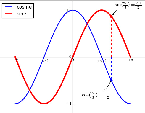 annotate(r'$\cos(\frac{2\pi}{3})=-\frac{1}{2}$',